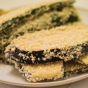 2. Slice eggplants into lengths. Crumb and let set in fridge. To crumb, dip eggplant in flour first, then egg mix, then into breadcrumbs.