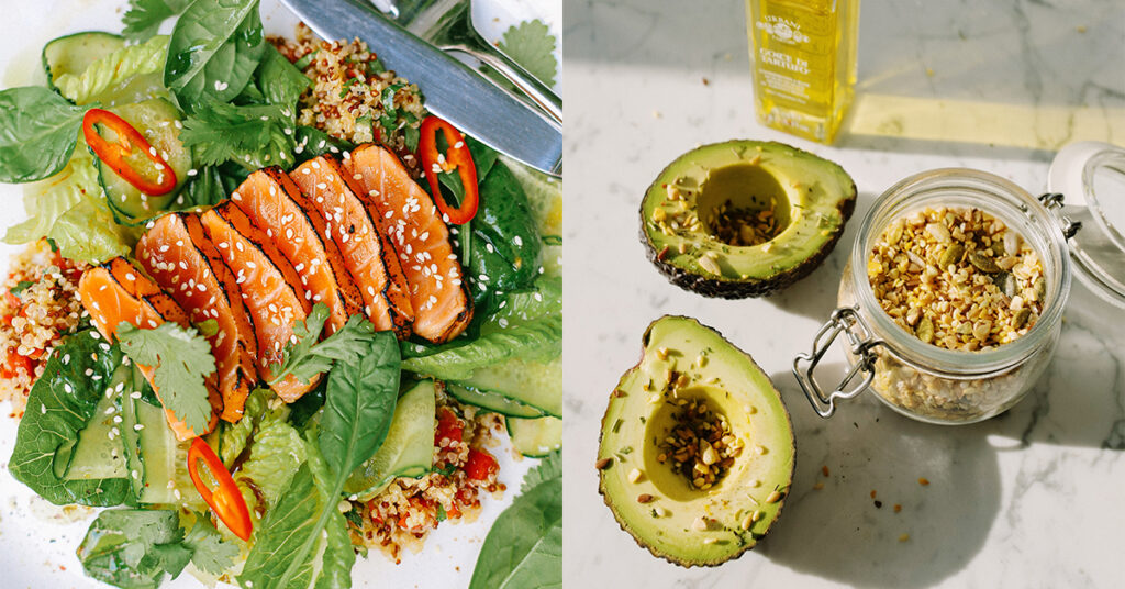 ⁃ Foods containing monounsaturated fats: fish, tahini, avocado, olive oil, canola oil, pine nuts, hazelnuts, almonds, cashews, peanuts, macadamias, pecans and pistachios.